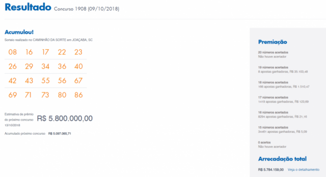 Resultado do último concurso, ocorrido em 05 de outubro de 2018. Confira: