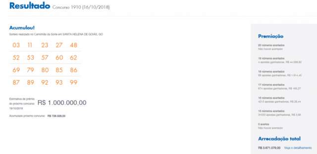 Resultado do último concurso, ocorrido em 13 de outubro de 2018. Confira: