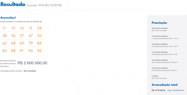 Resultado do último concurso, ocorrido em 19 de outubro de 2018. Confira:
