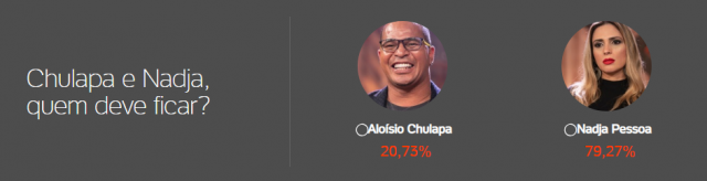 De acordo com a Enquete A Fazenda do UOL, às 9h40 desta quarta (24), Nadja Pessoa aparecia com pouco mais de 79% dos votos para ficar no programa, contra 20% dos votos de Chulapa.