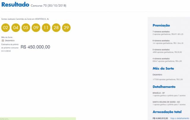 O sorteio do concurso 70 da Dia de Sorte está agendado para a noite desta terça-feira, 30 de outubro de 2018. O prêmio acumulado é no valor de R$ 1,5 milhão de reais. Tendo em mente que o sorteio ocorre às 20 horas, você tem até às 19h de hoje para fazer os seus jogos. As apostas podem ser feitas em qualquer lotérica do país.