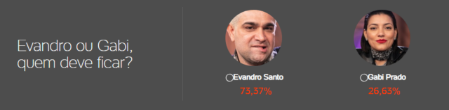 De acordo com a Enquete A Fazenda do UOL, às 14h35 desta quarta (31), Evandro Santo aparecia com pouco mais de 73% dos votos para ficar no programa, contra 26,63% dos votos de Gabi Prado.