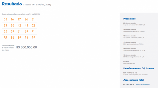 Os números sorteados foram: 07, 13, 16, 33, 38, 40, 42, 44, 56, 57, 61, 64, 65, 67, 74, 75, 80, 84, 89 e 96