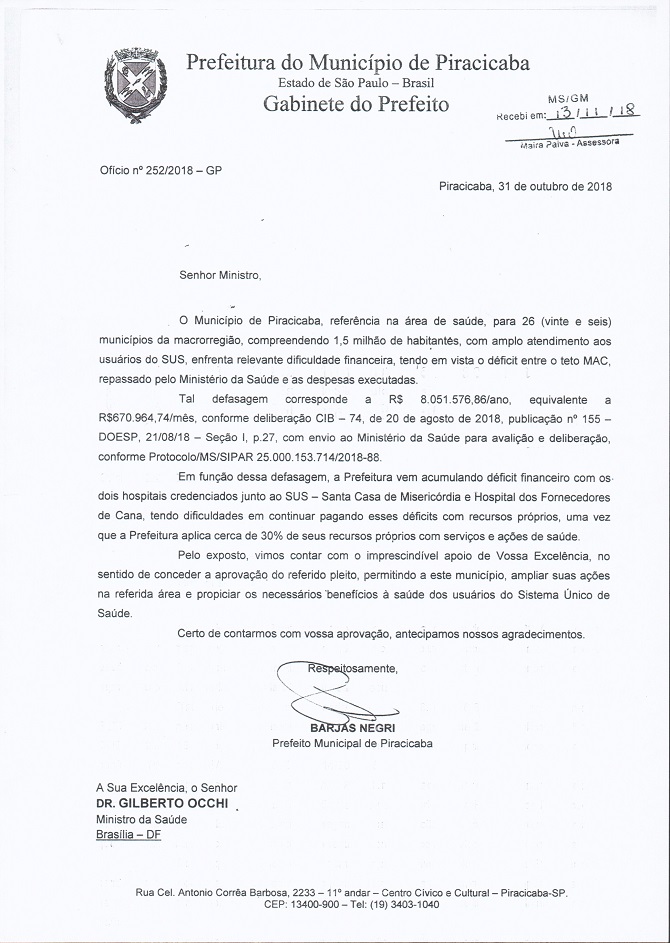 A Prefeitura de Piracicaba informou na manhã desta quarta-feira (14) que o prefeito Barjas Negri esteve ontem (13) em Brasília, numa audiência com o ministro da Saúde, Gilberto Magalhães Occhi, para solicitar R$ 8 milhões de reais. O valor é para custear as internações hospitalares, numa média de R$ 670 mil/mês. O assessor do ministro, Sérgio Luis da Costa, também esteve no encontro.