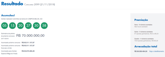 A aposta máxima, que consiste em quinze números, custa R$ 17.517,50 reais.