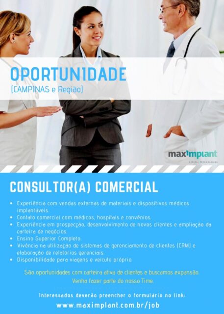 A Maximplant – Medical Technologies, abriu vaga de emprego em Campinas e região para o cargo de consultor(a) comercial.