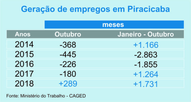 De acordo com dados do Ministério do Trabalho, Piracicaba tem mantido seu crescimento na geração de empregos. De janeiro a outubro deste ano, 1,731 novos postos de trabalho foram criados no município. 289 vagas somente no mês de outubro.