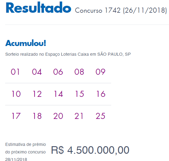 Como não houve ganhador no prêmio principal, o valor segue acumulado para o sorteio da Lotofácil 1743 desta quarta-feira, 28 de novembro de 2018.
