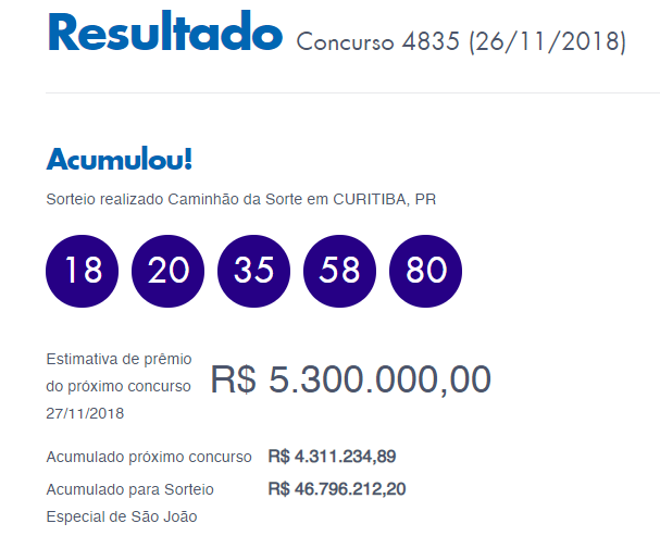 Confira na sequência os números sorteados no concurso 4835 da Quina desta segunda-feira, 26 de novembro de 2018: 18, 20, 35, 58 e 80