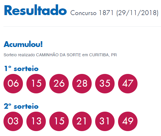 O sorteio do concurso 1871 da Dupla-Sena aconteceu na noite desta quinta-feira, 29 de novembro de 2018. Nenhum apostador acertou os seis números dos dois sorteios realizados. Por conta disso, o prêmio segue acumulado em R$ 2,9 milhões para o próximo sorteio que será realizado no dia 01 de dezembro de 2018.