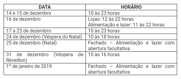 Por conta das compras de Natal, o Shopping Piracicaba anunciou seu novo horário de funcionamento a partir desta sexta-feira (14). Segundo a assessoria do shopping, as lojas, praças de alimentação e áreas de lazer funcionarão em escalas diferenciadas, com alterações até o dia 1º de janeiro de 2019. Confira abaixo.