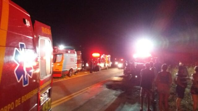 De acordo com o Corpo de Bombeiros, o acidente aconteceu por volta das 22h30 quando um carro bateu na traseira de um ônibus que transportava romeiros que seguiam para Aparecida do Norte (SP).