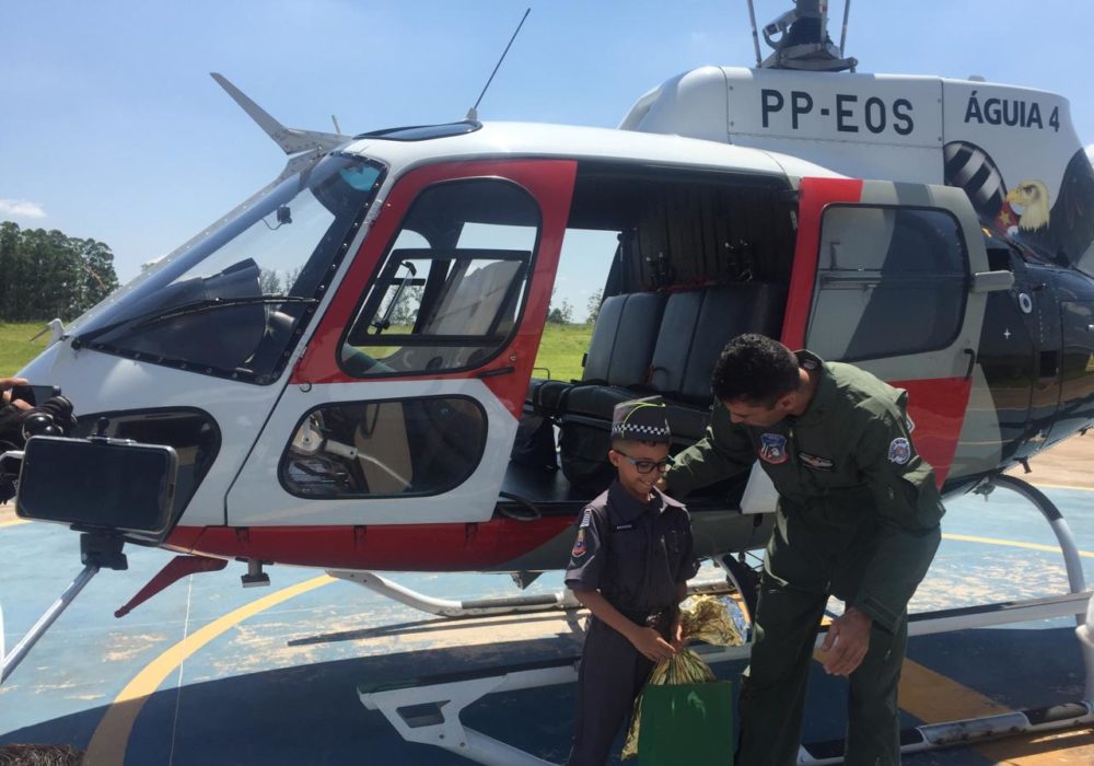 Depois de passar a tarde no Batalhão, onde ganhou uma farda de presente com o seu nome, o pequeno Rhamon Vitor foi levado até a sede do Helicóptero Águia da Polícia Militar, em Piracicaba, onde teve a oportunidade de conhecer o helicóptero de perto e vê-lo levantando vôo. O garoto ficou feliz!