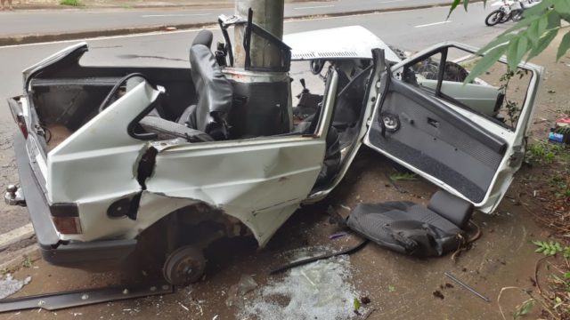 Carro fica destruído após ‘abraçar’ poste em Piracicaba (SP)