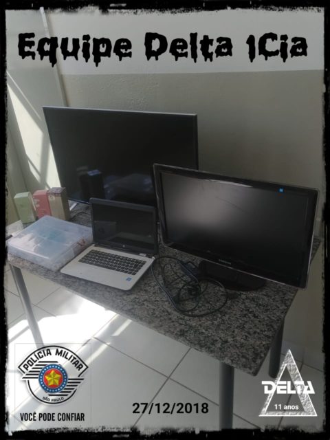 No interior do veículo, foram localizados todos os objetos levados da vítima, bem como as facas utilizadas no roubo. Os policiais apreenderam um veículo Ford Ka, um celular, dois televisores, um notebook, diversas joias e as duas facas.