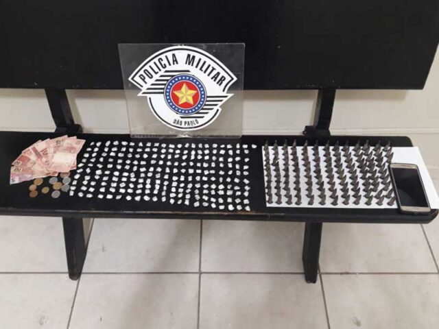 Já abordado, os PMs vistoriaram a sacola dispensada. Foram localizados, 123 pinos de substância aparentando ser cocaína e 211 papelotes de substância aparentando ser crack e mais R$ 78,50 em notas e moedas.