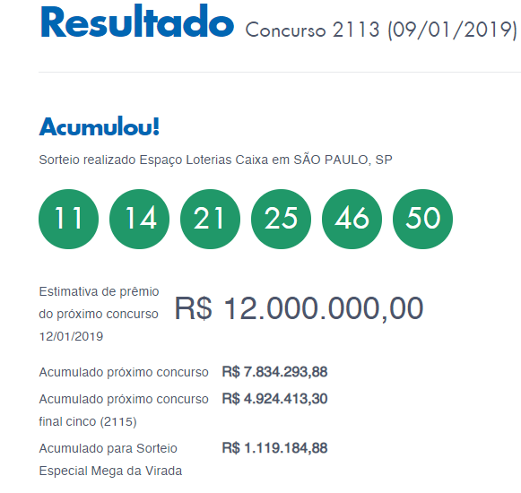 Confira os números sorteados na Mega-Sena 2113, realizado no dia 09/01/2019: 11 – 14 – 21 – 25 – 46 – 50