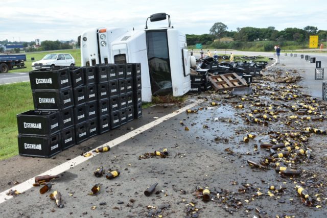 Caminhão carregado com 26 toneladas de cerveja tomba em rodovia de Piracicaba (SP)