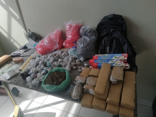 Já em frente à residência, os policiais militares sentiram um forte odor de maconha e logo em seguida, um indivíduo fugiu rapidamente pelos fundos da casa. No interior de residência a PM prendeu três pessoas pessoas que foram surpreendidas enquanto embalavam os entorpecentes. Neste mesmo cômodo, foram apreendidas diversas porções de cocaína (pinos) dentro de uma caixa térmica, um tijolo e meio de maconha, 96 embalagens de maconha fracionada, diversos pedaços de maconha, embalagens contendo pasta base de cocaína, 224 embalagens com crack, diversas embalagens e balança para pesagem.