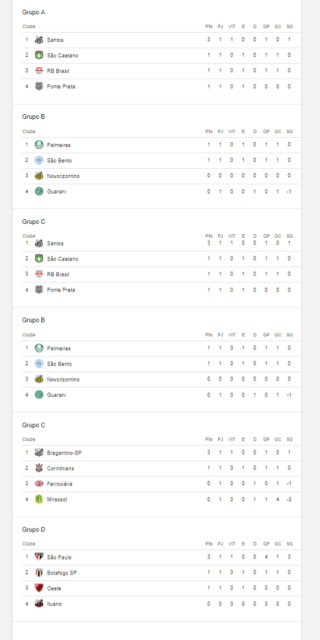 Confira na imagem a seguir como está a classificação dos grupos A, B, C e D do Paulistão deste ano.
