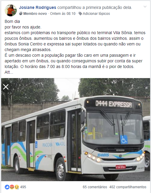 “Estamos com problemas no transporte público no terminal Vila Sônia”, escreveu a leitora no grupo de interação do PIRANOT. “Temos poucos ônibus. Aumentou os bairros e ônibus dos bairros vizinhos. Assim o ônibus Sonia Centro e Expressa saem super lotados ou não vem ou chegam mega atrasados.”