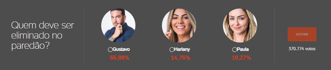 De acordo com a Enquete BBB19 do UOL, às 09h45 desta terça (29), Gustavo aparecia com pouco mais de 65% dos votos para sair do programa, contra 19% de Paula e 14% de Hariany.