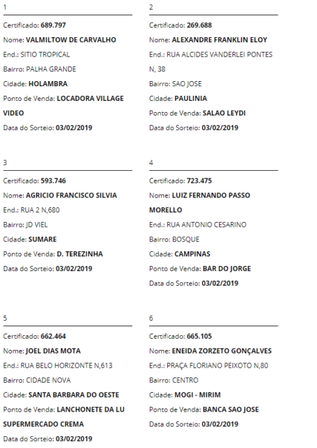 Neste domingo, 03 de fevereiro de 2019, aconteceu mais um sorteio do Vida Cap. O PIRANOT divulgará todas as datas do sorteio e também os resultados completos. Acesse sempre www.piranot.com e confira!