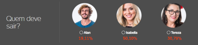 A Enquete BBB19 do Jornal PIRANOT e do UOL, apontam que a Isabella será a eliminada na noite desta terça-feira (26). De acordo com as enquetes, às 08h25 de hoje, ela aparecia com pouco mais de 50% dos votos para deixar o programa. Enquanto Alan tinha 19% e Tereza 30% dos votos.