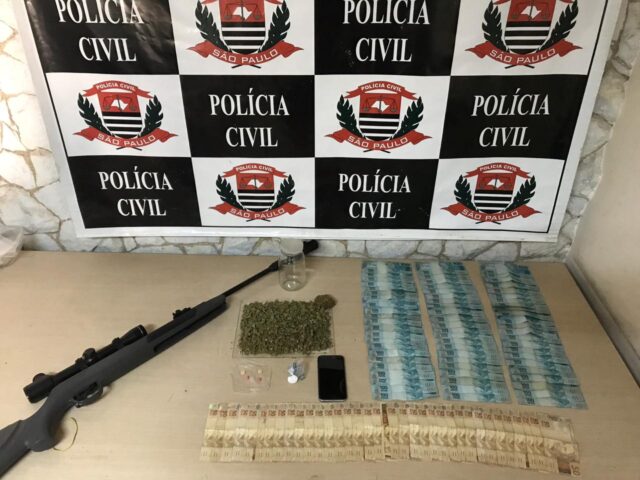 Em buscas domiciliar, foram localizados aproximadamente 70g haxixe, um tipo de maconha, quatro comprimidos de ecstasy, uma porção de cocaína, uma espingarda de pressão equipada com luneta, além da quantia de R$8.500,00 mil reais.