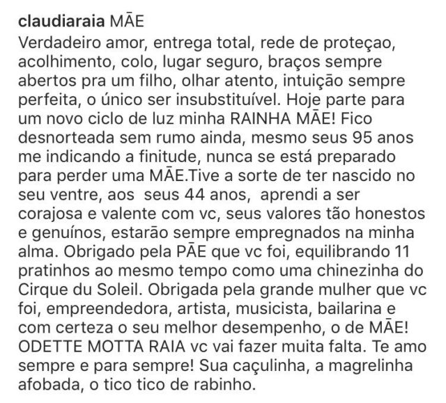Nesta terça-feira (19), morreu aos 95 anos, Odette Motta Raia, mãe da atriz Claudia Raia. Sem dar mais detalhes sobre a causa da morte, a atriz usou as redes sociais na manhã desta quarta-feira (20) para fazer uma homenagem emocionante à mãe, ela publicou um texto, além de várias fotos ao lado de Odette.