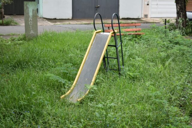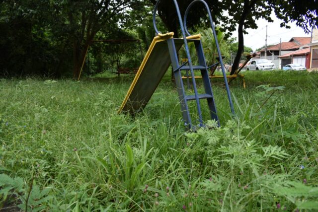 Fora isso, a área verde deveria também funcionar como um parquinho para as crianças brincarem; contudo, por conta do mato alto, os pais não deixam suas crianças brincarem no local. “Já fiz solicitação para recuperarem os brinquedos, mas eles vieram aqui há um tempo atrás e apenas pintaram os brinquedos. Eu acompanhei. Mas os brinquedos estão todos quebrados! A pracinha, que deveria se destinar à diversão das crianças, está com mato alto e não há a menor condição de levar nossos filhos lá. Eu jamais levaria o meu. Nossa situação é de abandono.”