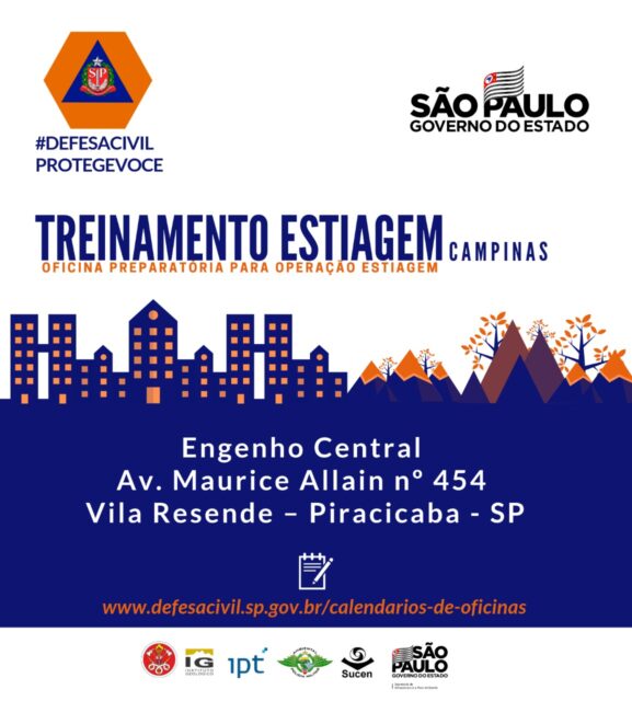 A Coordenadoria Estadual de Proteção e Defesa Civil (CEPDEC/SP) realiza, em parceria com o Corpo de Bombeiros, a 6ª edição da Oficina Preparatória para Operação Estiagem (OPOE). O treinamento acontece nesta quinta-feira (25), a partir das 08 horas, no Engenho Central de Piracicaba, e visa deixar as corporações preparadas para problemas típicos do período de inverno, como estiagem, crise hídrica e fogo em mato.