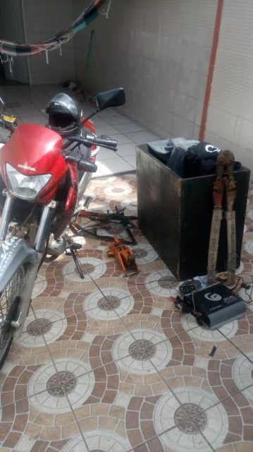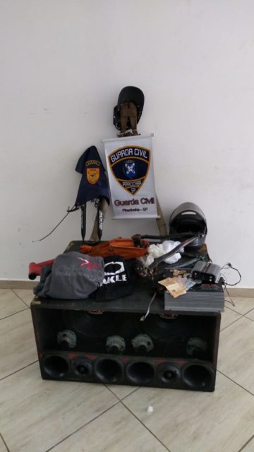 Os guardas juntamente com a Polícia Militar, entraram na casa e localizaram a motocicleta. Também foi apreendido outros equipamentos que podem ser produto de crime, como peças de bicicletas, capacete, uma caixa de som grande, com quatro alto-falantes e outras quatro cornetas, um alicate de corte grande e um macaco veicular.