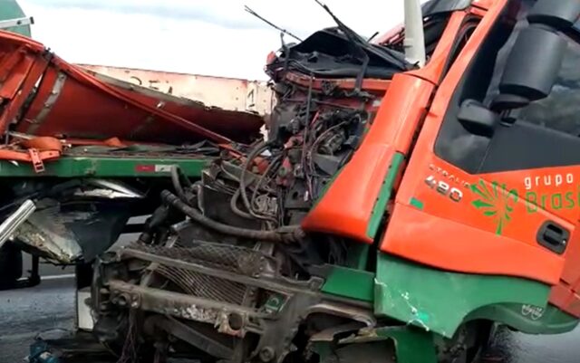 Um dos motoristas envolvidos no acidente alegou que perdeu o controle do caminhão após um carro, que trafegava logo a frente, frear bruscamente. O veículo que ele dirigia ficou em “L”, fazendo com que o carregamento atingisse e destruísse a cabine do próprio caminhão.