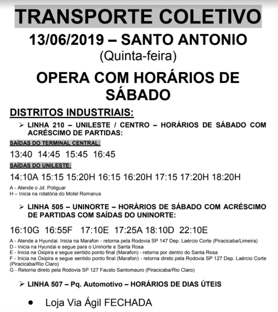 A Via Ágil (empresa responsável pelos ônibus do município) informou que, neste feriado de Santo Antonio, grande parte de suas linhas irá circular em horário de sábado, com exceção das linhas abaixo que operam com horários especiais.