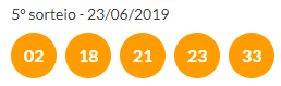 Os números sorteados no 5º e último sorteio da Tele Sena de São João foram: 02, 18, 21, 23 e 33.