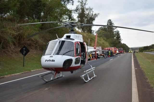 O Águia da PM pousou na rodovia por volta das 16h55, e, por conta disso, o trânsito de ambos os sentidos segue interditado.