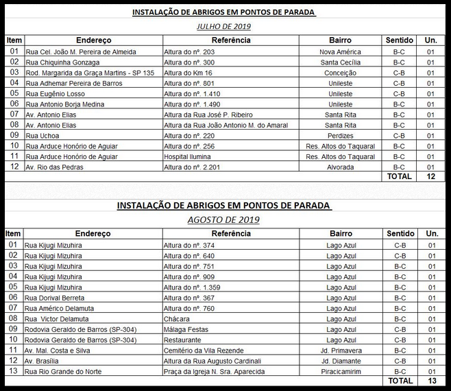 A empresa Metalflex, responsável pelo serviço, segue o contrato com a Prefeitura de Piracicaba e tem um prazo de 24 meses para concluir a instalação dos 300 abrigos adquiridos. Até o momento, 250 novos abrigos de ônibus já foram instalados. O contrato no valor de R$ 960.949,08 reais foi assinado no dia 8 de setembro de 2017, pelo prefeito Barjas Negri.