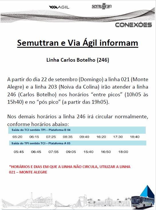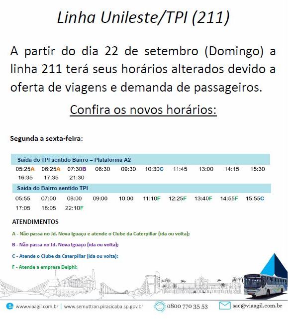 A Via Ágil anunciou, nesta semana, alterações de horários e trajetos em mais de cinco linhas de ônibus de Piracicaba. As alterações entram em vigor neste domingo, 22 de setembro, e foram feitas em parceria com a Semuttran (Secretaria Municipal de Trânsito e Transportes) do município. Confira abaixo todas as mudanças.