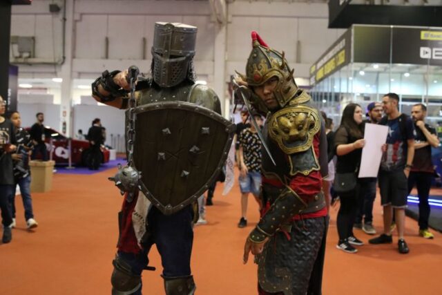 O auxiliar administrativo Igor Rodrigues dos Santos, que interpreta o Tiandi do game For Honor, diz que a vida de cosplay é bem corrida. “Quando você chega no evento e veste a roupa fica só por conta de tirar foto. Mas gosto de participar de concursos e já estive no concurso daqui no ano passado”.