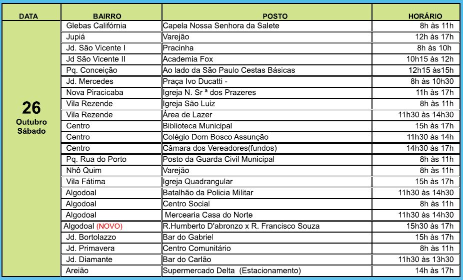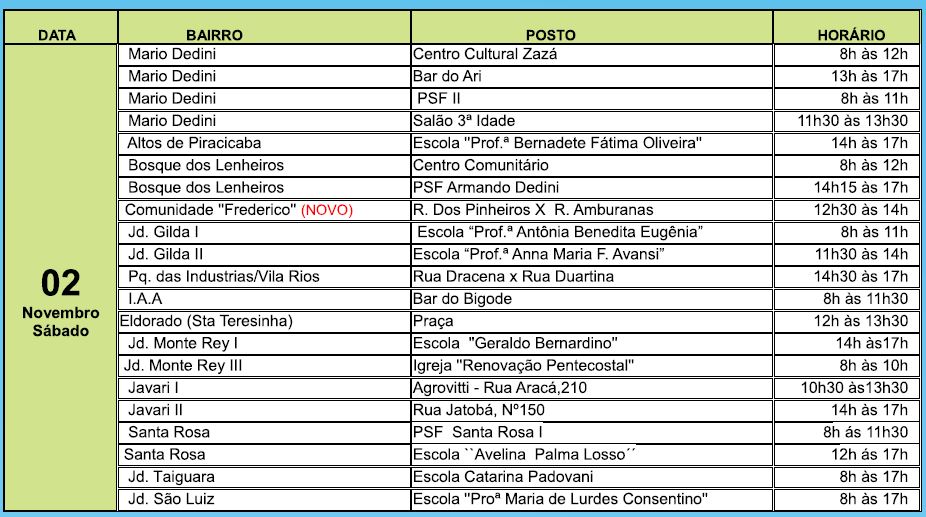 Dias e horários da vacinação nos bairros