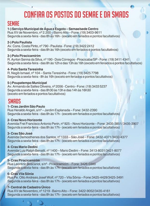 Para atender todas essas famílias, o Semae terá cinco pontos de atendimento. O primeiro é a sede na Rua XV de Novembro (Bairro Alto), já os outros pontos estão nos bairros Paulista, Piracicamirim, Santa Teresinha e Poupatempo (Centro), que funcionam entre 08h e 16h, de segunda a sexta-feira — veja relação ao fim desta matéria.