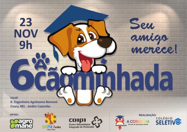 O Colégio Seletivo convida você e seu melhor amigo de pelos para participarem da 6ª Cãominhada realizada pelo colégio. O evento acontece em Piracicaba no próximo sábado (23), a partir das 09h, com concentração em frente ao Seletivo, localizado na Rua Engenheiro Agrônomo Romanó Coury, 481, bairro Jardim Caxambu.