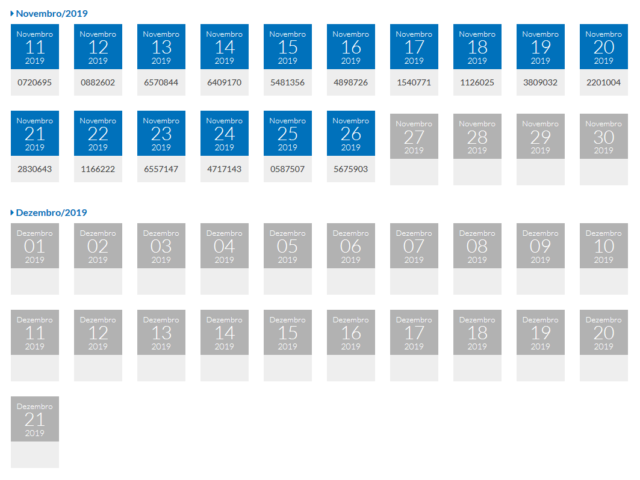 Diariamente, durante o período da campanha da Tele Sena de Natal 2019, que vai de 11/11/2019 a 21/12/2019, haverá o sorteio de um caminhão de prêmios. Você concorrerá com o seu “Número da Sorte”, composto por uma sequência de sete números impressos na parte interna do seu título. Se o seu “Número da Sorte” for sorteado, você ganha na hora um caminhão lotado de prêmios.