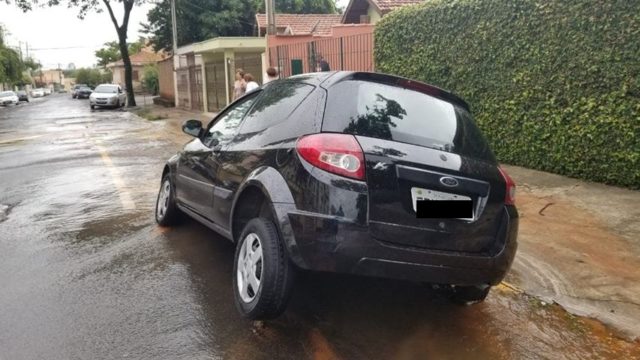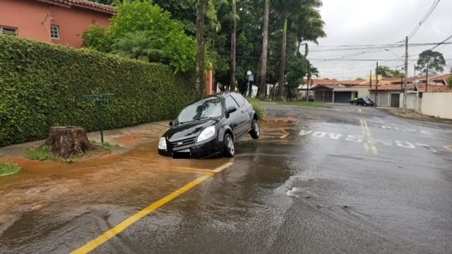 Após a forte chuva que atingiu Piracicaba na noite desta quarta-feira (27) e na madrugada desta quinta (28), um grande buraco se abriu em uma rua do bairro Nova Piracicaba e deixou um veículo Ford Ka preto completamente atolado. O incidente ocorreu na esquina da Rua Joana D’arc com a Rua das Pombas.