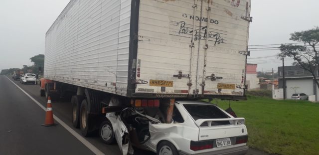 Na manhã deste domingo (15), um Volkswagen Gol branco ficou destruído e o motorista ferido gravemente após entrar embaixo de um caminhão. O acidente foi na Rodovia Geraldo de Barros.