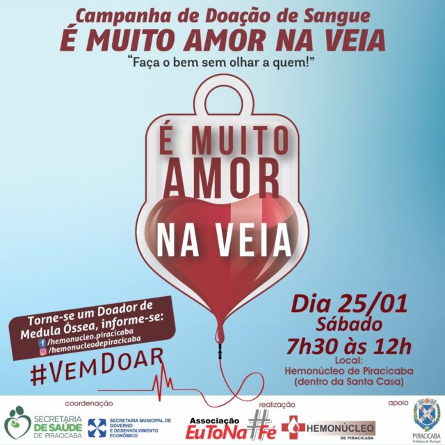 A 6ª edição da campanha de doação de sangue “É Muito Amor na Veia” acontece em Piracicaba na manhã do dia 25 de janeiro de 2020. A doação de sangue poderá ser feita das 07h30 às 12h, no hemonúcleo da Santa Casa, localizado na Avenida Independência Nº 953, no bairro Alto.