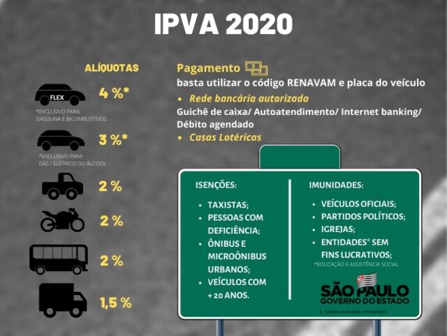 Os proprietários de veículos registrados no Estado de São Paulo podem conferir o valor do Imposto sobre a Propriedade de Veículos Automotores (IPVA) de 2020 em toda a rede bancária a partir desta sexta-feira (20). A consulta pode ser realizada nos terminais de autoatendimento, pela internet ou diretamente nas agências, bastando o número do Renavam do veículo.