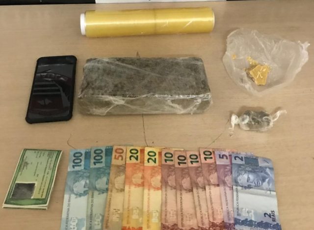 No interior da residência, mais entorpecentes foram encontrados. Ao todo, policiais apreenderam um tijolo de maconha, um pedaço de maconha, uma pedra bruta de crack, material para embalo das substâncias, além de R$ 337 reais proveniente das vendas.