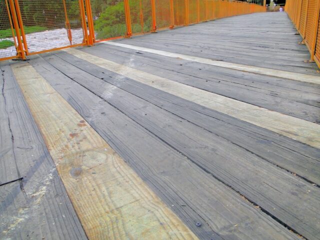 Além das pranchas de madeira tratada, também são usados parafusos especiais. A estrutura da passarela é formada por duas camadas de tábuas de 3 cm cada, uma sobre a outra. Cerca de 150 tábuas que ficam na parte de cima serão substituídas.